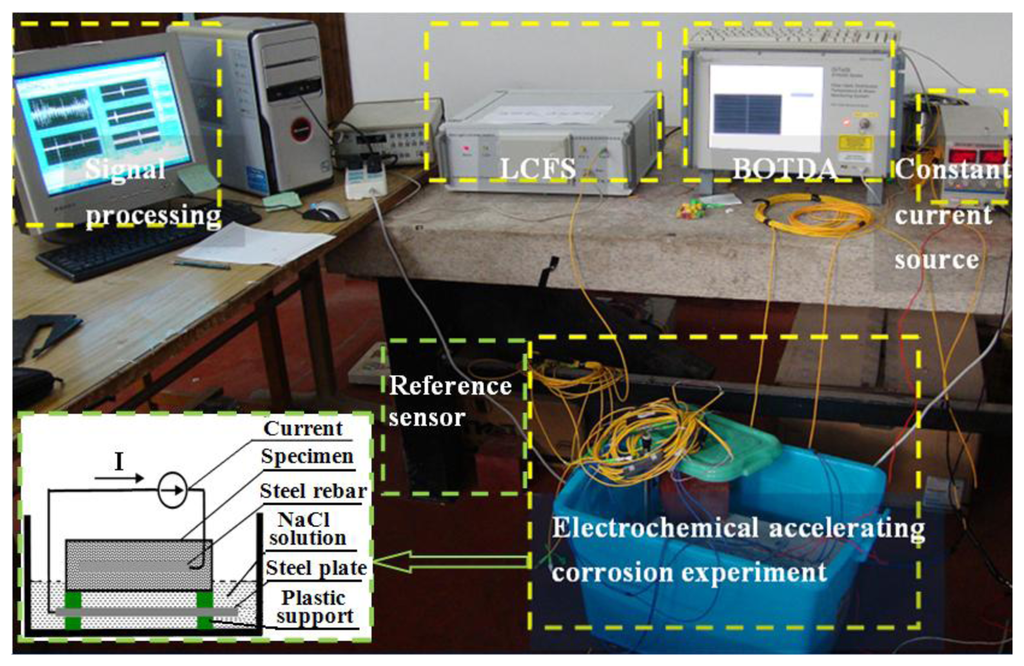 Before the experiments being done, the concrete specimen was placed in the bath solution for one day, and then a constant current was applied from the rebar to the plate to connect the bath solution and formed a 40 mA electrical current. Thus the steel rebar acted as an anode and the stainless steel plate functioned as a cathode. On the other hand, the specimen with the reference fiber was not connected to the electrical current and only put on near the corrosion specimen. The experiments were carried out in a room at a constant temperature of 22 °C.