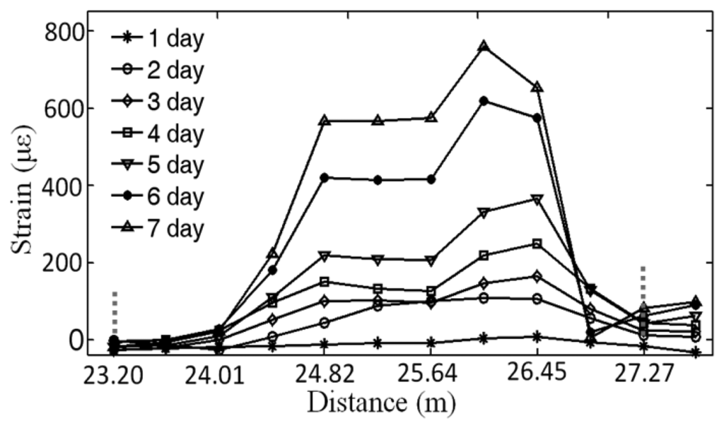 Figure 6 showed a corrosion expansion distributed strain monitored by the BOTDA for the specimen at the distance of introduction fiber between 23.20 and 27.27 m, which was indicated by the two vertical dashed-gray lines and corresponding to the 3 meter length of the sensing fiber, l1, plus the spatial resolution, Δz, i.e., l1+Δz ≈ 4.0 m. The curves from 1 day to 7 day were presented the increasing of the distributed strains within 7 days, respectively.