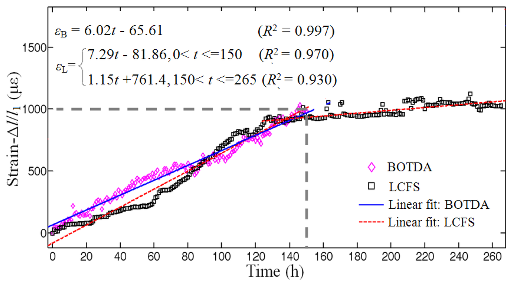 The diameter of the steel rebar was 18 mm, and then its perimeter was about 18π ≈ 0.056 m. The distance resolution of the BODA was 0.41 m, which was determined by the sampling rate of the analog-digital-convertor. This made the BOTDA record only one datapoint every 0.41/0.056 = 7 circles of the sensing fiber around the steel rebar. Hence, the reason should be due to the fact that the read out strains by the BOTDA was the convolution results between the sensing fiber length and the spatial resolution [17,18]. Thus it was also a kind of averaged strain. On the other hand, the LCFS accumulated all the strains, no matter whether sharp or not, as the total deformation of the sensing fiber, so these two sensors matched well the early stages of the corrosion experiment.