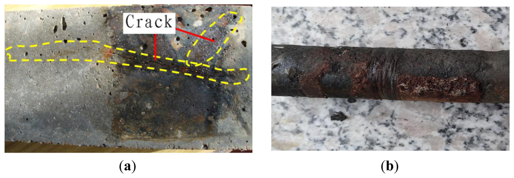 After the experiments, some cracks were found at the bottom of the specimen, as shown in Figure 8a. The longest of the crack reached about 100 mm, whereas the others were around 40 mm. The position of the rust spilled out of the specimen was close to the sensing fiber wound. The steel rebar with the sensing fiber were taken out from the specimen after the experiments, as shown in Figure 8b. The rebar was severely corroded and obvious rust was distributed between the steel and sensing fiber winding places.
