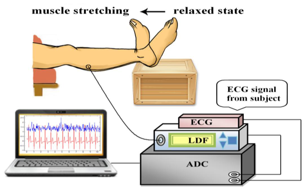 Figure 1 shows the measurement system applied in this investigation. The system measured the microcirculatory blood perfusion and electrocardiogram (ECG) from the participants simultaneously and synchronously. The acquired analog signals were sampled via an analog-to-digital converter (ADLINK, PCI-9111DG, Taipei, Taiwan) with a sampling rate of 1,024 Hz and then analyzed using a personal computer. The location of microcirculatory measurements was on the belly of gastrocnemius muscle at the posterior of the lower leg. The ECG signals in the lead II configuration were monitored by the bio-impedance amplifier (EBI100C, BIOPAC System, Goleta, CA, USA) with surface electrodes. The microcirculatory signal was detected using LDF (VMS-LDF1-HP, Moor Instruments, Axminster, Devon, UK) in a sampling frequency of 40 Hz and a skin probe (VP1-V2-HP) with optical fiber separation of 4 mm. A laser with the power of 20 mW and the wavelength of 785 nm was adopted in the applied LDF. LDF was calibrated before measurements using aqueous suspension of polystyrene latex particles. All of the measurements were conducted according to laser safety requirements (Class 3R per IEC 60825-1:2007).