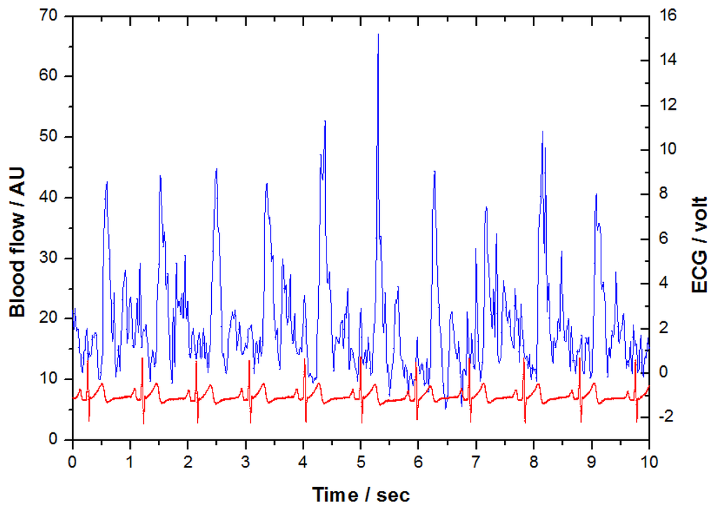 Figure 3 shows the original LDF and ECG signals obtained from the measurement system synchronously. There were 61,440 samples (1,024 × 60) for each 1-min measurement with a sampling rate of 1,024 Hz. When inspecting two coherent signals in this Figure 3, the signal with distinctly repeated patterns is the electrocardiogram. The other one which does not have a specific pattern is the LDF signal. It can be appreciated the peaks of LDF signal appeared synchronously correlated with the R-peaks of ECG signal after a certain phase delay. In order to determine the length of the LDF signal of each beat, the “beat-to-beat” algorithm was applied [15–17]. According to this algorithm, the “waveform” of LDF signals in heart-beat frequency was derived. Based on the characteristics of microcirculatory waveform, three quantitative indices were developed respectively. The five steps of the signal processing are illustrated as follows: