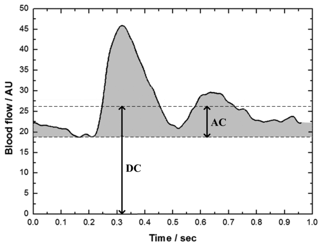 Among the noninvasive methods for monitoring the perfusion in peripheral tissues, the peripheral perfusion index (PI) defined as the ratio of pulsatile to nonpulsatile components of photoplethysmographic waveform in pulse oximetry has been widely applied in clinical application [18,19]. Similarly, three indices of DC value, AC value and perfusion pulsatility (PP) were defined from the mean LDF waveform in the present study (Figure 4). DC value is the mean blood flow of the mean waveform, which is the blood perfusion in tissue for general clinical use. AC value is the mean of the pulsatile part (shadow area) of the mean waveform. PP value is defined as the ratio of AC value to DC value as shown in Equation (1):