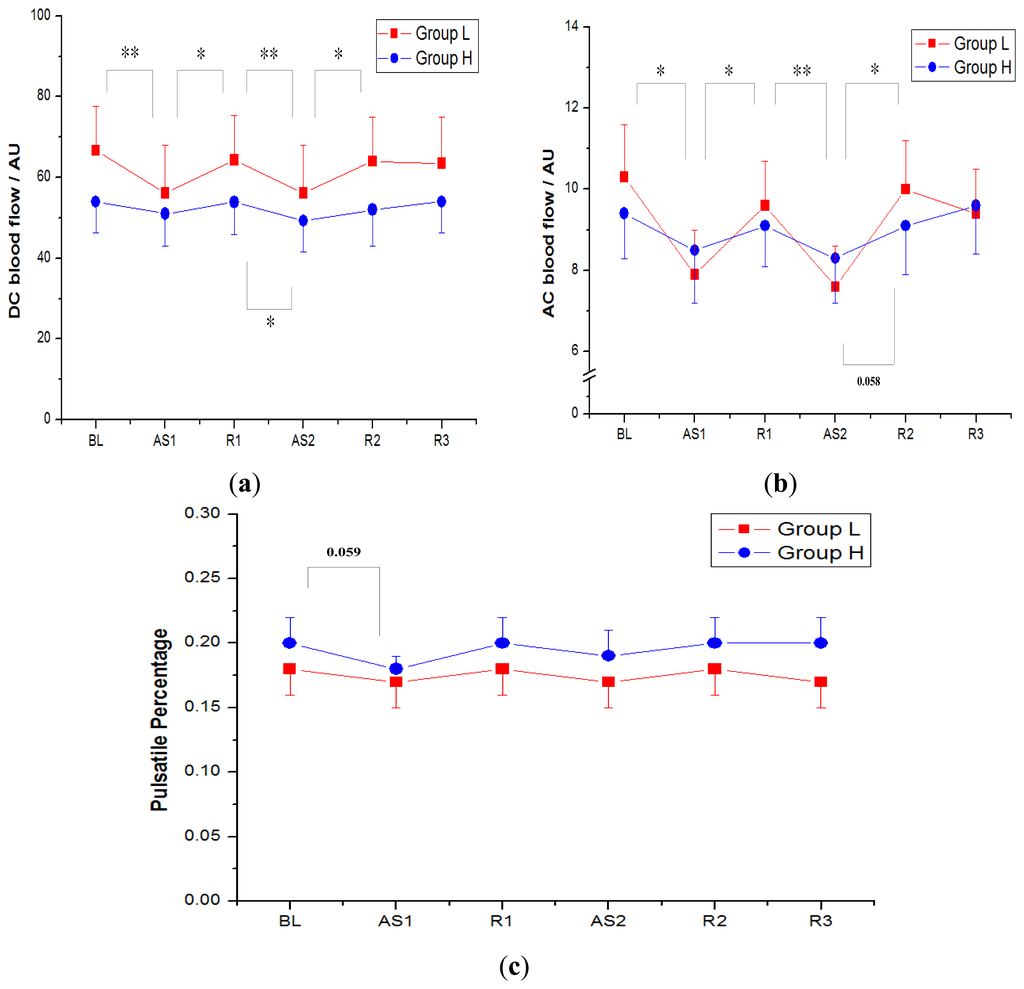 All three indices of the LDF perfusion signals between group H and group L were compared to study the inter-group variation by using an independent t-test. In order to understand the effects of active muscle stretching on microcirculation, a paired-sample t-test was used to study the difference of LDF signals between two adjacent measurements with the muscle in different states. The differences were considered as significant when two-tailed significance level p < 0.05. The Statistical Package for Social Science (release 12.0, SPSS Inc., Chicago, IL, USA) was used for the statistical analysis.