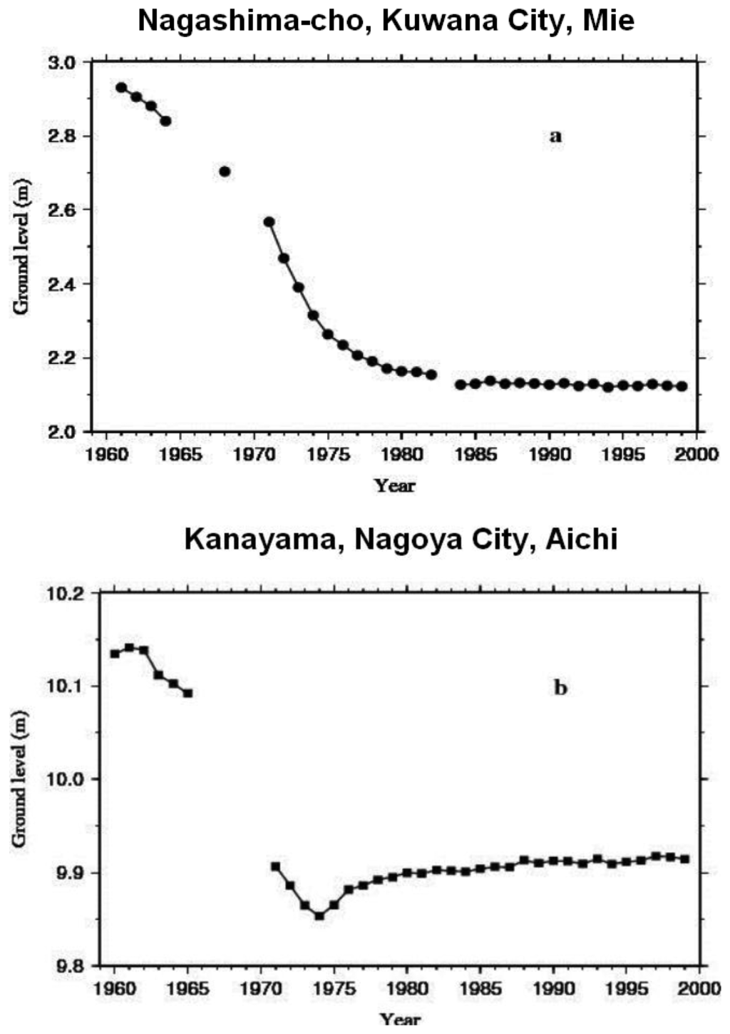 Ground subsidence over the Nobi Plain is a natural phenomenon occurring due to natural compaction of the soft sedimentary layers of the plain and the tilting of the Nobi geomorphologic structure itself [1–3]. Subsidence rate of 23 cm/year was recorded at an observational point in Minato Ward, Nagoya, in 1973. However, such a large-scale subsidence cannot be explained by the above-mentioned factors alone. The acceleration of compaction and contraction due to falling groundwater levels can be pointed as one of the other major man-made factors with potentially remarkable impacts. These falling levels are a consequence of the fast increase in pumping ground water following the rapid postwar economic growth over the area, and which could not be matched by natural replenishment of ground waters [1–4]. Similar ground level subsidences have also been reported in relationship with the overexploitation of ground waters in many other parts of the World (see [5] for a detailed review).
