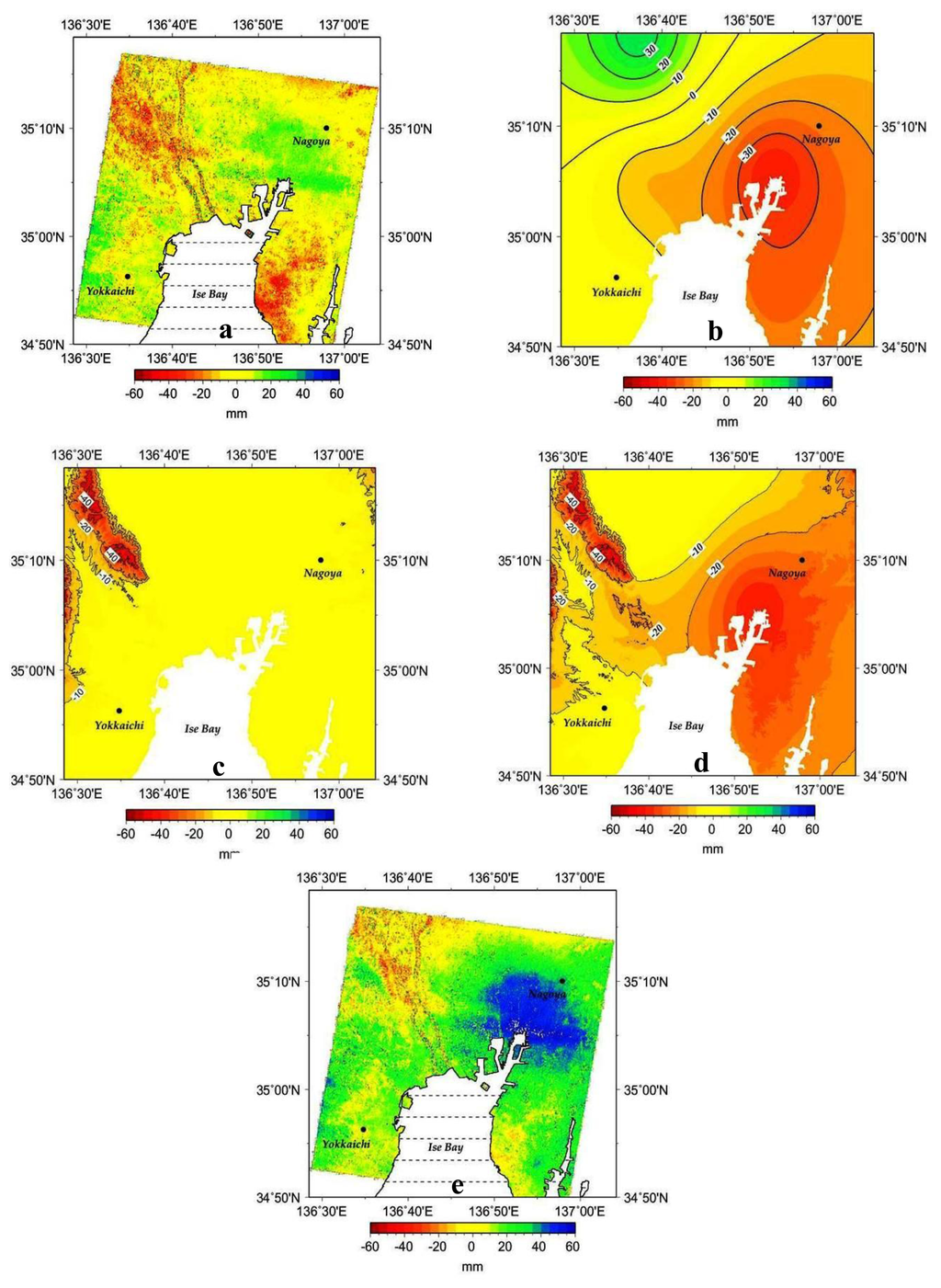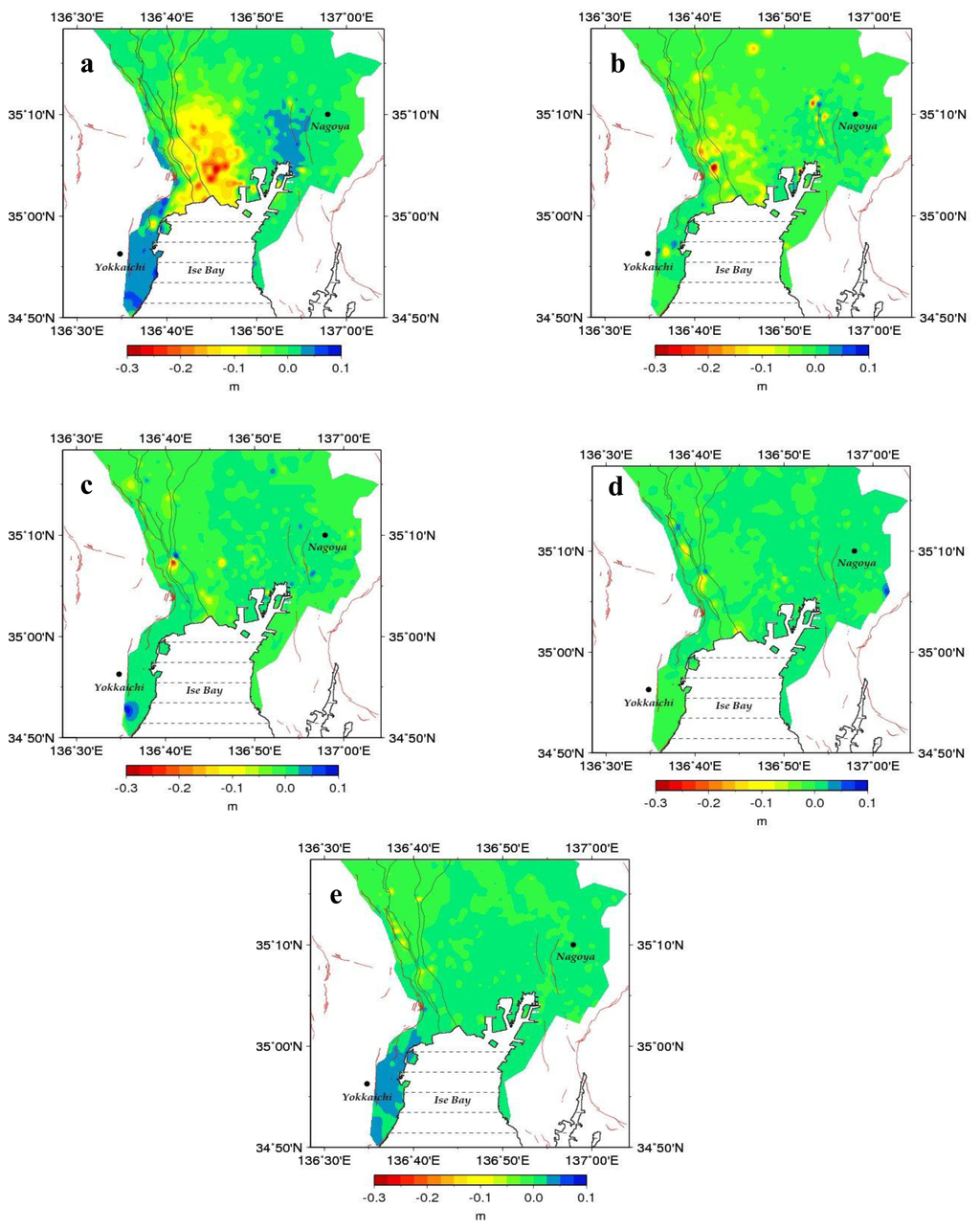 While ground subsidence has eased over most of the area since the 1980s and a gentle rising of the ground has begun in the area south of the Yoro Fault and elsewhere, continued subsidence is still observed over the area from the estuaries of the Kiso group of Rivers to the Waju district (Figure 3b,c). This rising trend is still observable during the 1990s, even in such urban areas as Nagoya, more likely in response to the previous severe subsidence that had induced relatively large amounts of land deformation to spread over unto the vicinity of those loci which were affected the most by subsidence (Figure 3d,e).