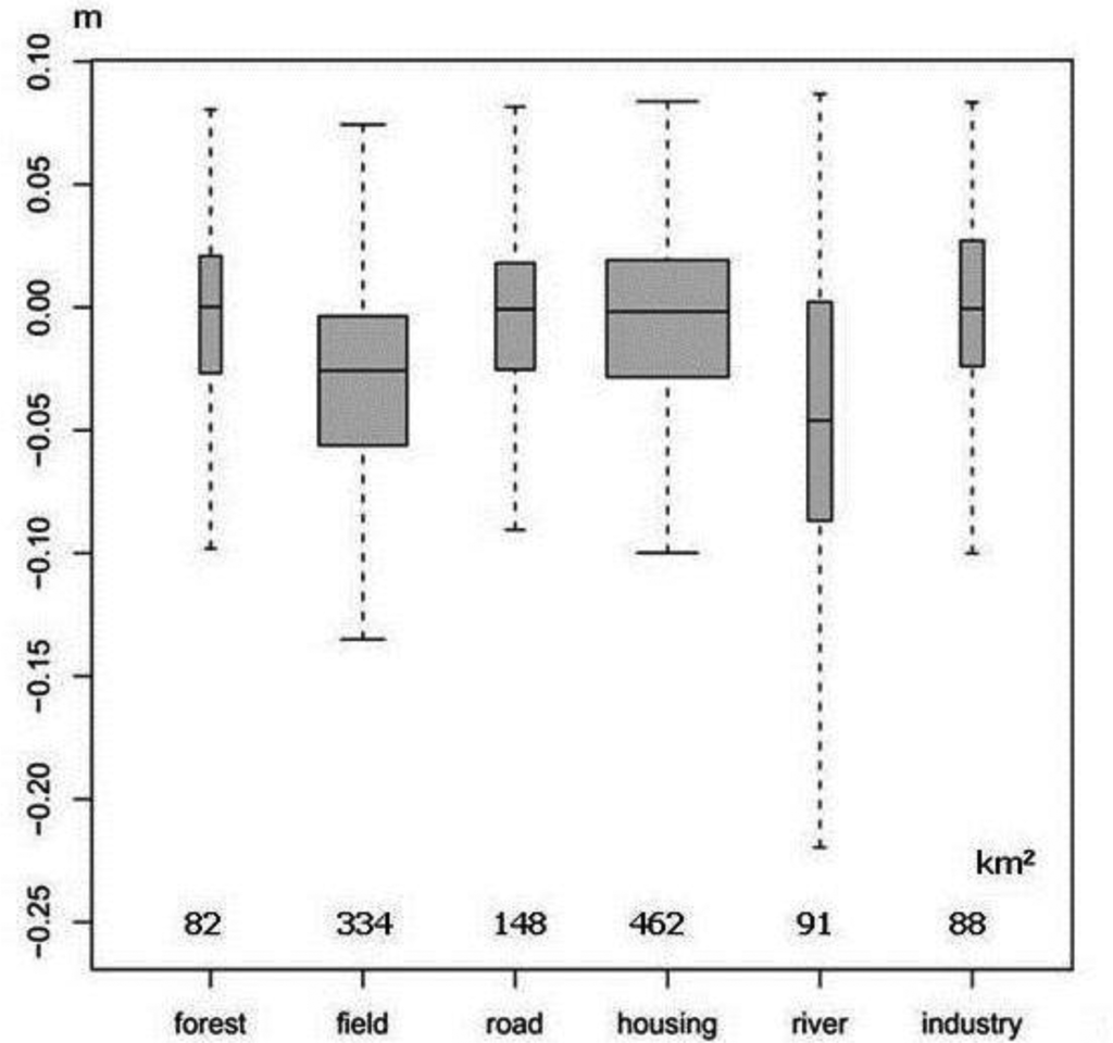 A relationship between land use and land cover (LU/LC) categories in the Nobi Plain and the amount of variation in land elevation is highlighted: the amount of land subsidence tends to be larger in areas covered by water bodies and smaller on industrial lands (Figure 4). In general, most of firm foundation structures are found on industrial lands. The rate of subsidence by these structures is seen to be strongly reduced, more likely because they are anchored in a more secured manner to the deep bedrock. Although the subsidence effects are felt across the area as a whole, this anchoring makes industrial structures less affected by such factors as land compaction due to groundwater removal or land expansion consecutive to groundwater recovery [44].
