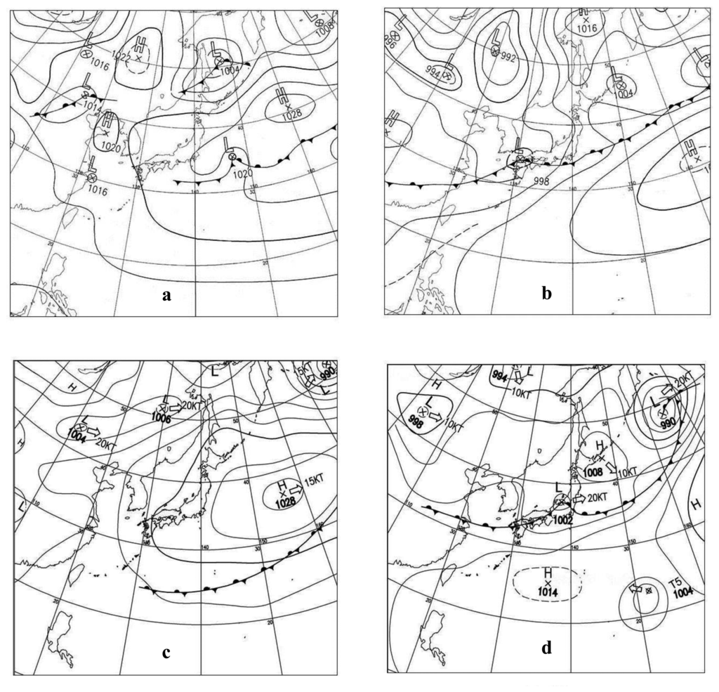 In order to identify analog weather charts, (step 2 of our methodology, see Section 2.4), we mainly compared the spatial distribution of isobars and the positions of seasonal rain fronts on the charts. Water vapor contained in the atmosphere is limited by temperature, and there is a maximum level that cannot be exceeded. While comparing the meteorological elements (steps 3 and 4 of our methodology), it became more apparent that air temperature was the most influential element for our analysis. In fact, when comparing surface observation data in step 3, we set empirical threshold values of 5 °C for the difference in air temperature and 5 hPa for the difference in sea-level air pressure.
