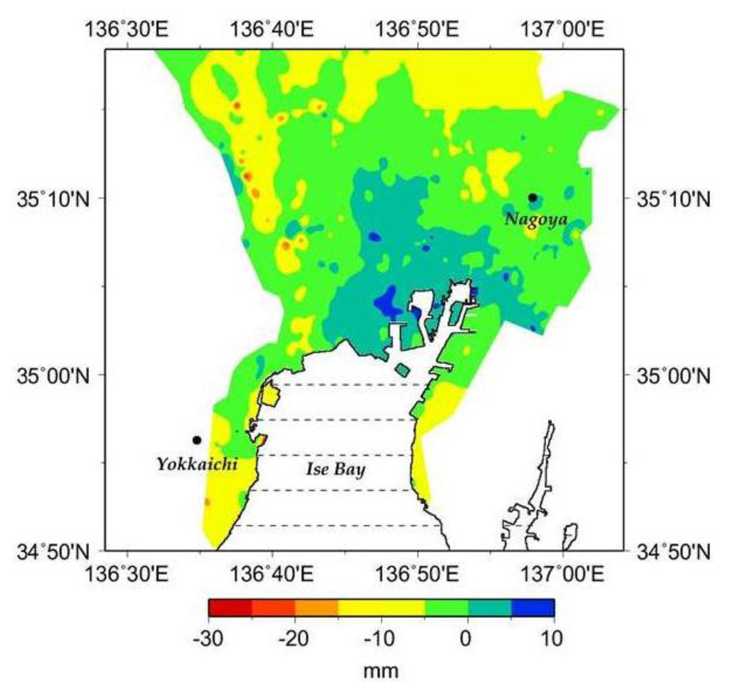 - Fukuyama, K. The Application of InSAR and Remote Sensing to Temporal and Spatial Variability of Land Subsidence over the Nobi Plain; Research Report on Land Subsidence in Mie Prefecture, Mie Prefecture Land Subsidence Survey Committee: Tsu, Japan, 2005; pp. 1–18. (in Japanese) [Google Scholar]