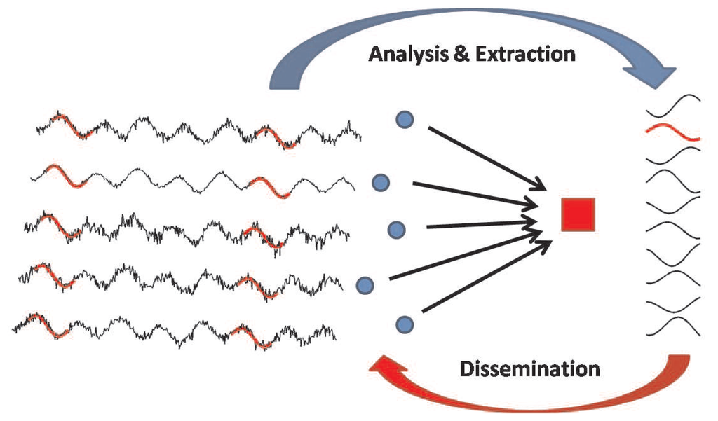 Figure 1 illustrates how the system works: sensor nodes (blue circles) produce information flows related to the same physical phenomenon and transmit the raw information towards a gateway. For simplicity, we assume that a single phenomenon is monitored and that all nodes are of the same type, and leave more complex scenarios for future work. The gateway, which is unaware of the particular type of information carried by the data flows, analyzes the raw data in order to identify the most frequent trends. After an initial training period, the gateway is able to compute a set of patterns and to disseminate them back to the nodes (details are in Section 4.1). Then, the nodes compare the sensed information with the received pattern set, and instead of sending the whole data sequence, they just send the pattern identifier (details are in Section 4.2).