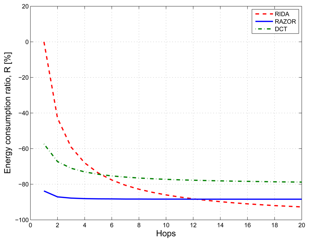 Figure 10 shows with blue solid, red dashed and green dash-dotted lines the results for RAZOR, RIDA and DCT, respectively. While RAZOR and DCT have almost the same behavior with RAZOR outperforming DCT, thanks to its lower computational complexity, RIDA has a very high energy consumption (as high as what is needed to send the uncompressed signal) in small networks, but shows a rapid improvement as the network size increases, outperforming both DCT and RAZOR when the number of hops is larger than 12.