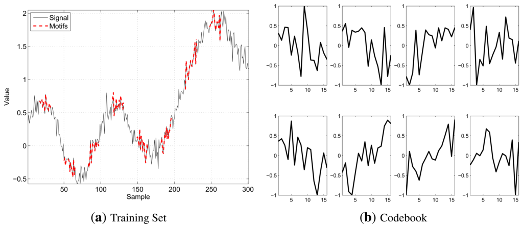 As per our objective, the best segment to be included in the Codebook is the one obtaining the highest number of matchings and that is representative of all the segments it matches with, since their distance is lower than the threshold. Hence, our algorithm iterates, until either the training set is empty or the desired Codebook size, Ktarget, is reached by selecting at each step the best segment and deleting it and all the segments that match with it from DM and MM. In case of ties, when two or more segments have the same number of matches, our algorithm picks that with the smallest average distance from the segments for which it is representative. The selected motifs will be referred to as X(k), k ∈ {1,…, K}. Figure 2 shows a training set example (on the left), highlighting, in bold red, those segments selected by the extraction algorithm to form the Codebook and the generated Codebook (on the right), for K = 8, N = 16 and b = 8. In the Codebook, the segments are stored in their normalized version, as they take values in [−1, 1].