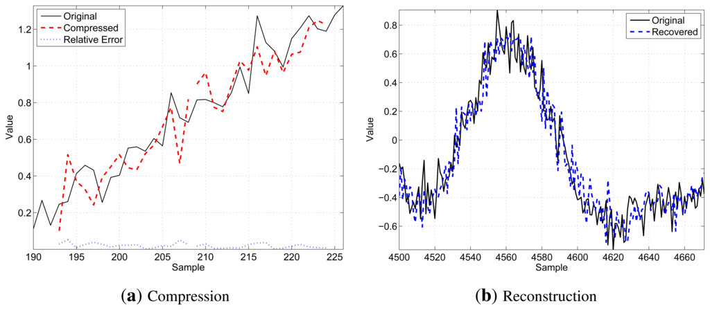 Figure 3 shows a qualitative example of the decompression procedure for N = 16, K = 8 and b = 8: on the left side, Figure 3a illustrates two consecutive segments (thin black solid line) of N samples, as well as the related compressed values (bold red dashed lines) and the relative compression error (thin blue dotted lines in the bottom part of the chart), while on the right side, Figure 3b shows the result of the decompression operation comparing a longer segment of the original signal (thin black solid line) with the received data after the decompression (bold blue dashed line). These figures have been chosen to provide graphical examples of what a motif looks like and how the re-constructed signal compares to the original one.