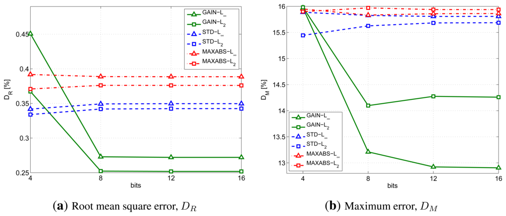 Figure 4 shows the effect of the number of bits used on the compression distortion. In particular, Figure 4a provides the Root Mean Square Error (RMSE) for different dissimilarity metric and g combinations, while Figure 4b provides the maximum error. The Codebook has been computed us K = 16 motifs of N = 20 samples and dth = 16% of the original segment amplitude. In the figures, the GAIN, STD and MAXABS techniques are plotted with green solid lines, blue dashed lines a red dash-dotted lines, respectively. Instead, triangular and square markers represent the infinity and L2 norm, respectively.
