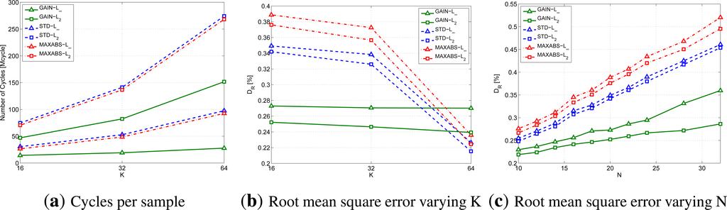 In particular, Figure 5a shows the cycles per sample performed by the device CPU to compress the signal; this figure has been obtained for K = 16, 32 and 64 and N = 20. Note that the values picked for K are those that correspond to an integer value for log2(K). Similarly, Figure 5b provides the root mean square error using the same parameters.