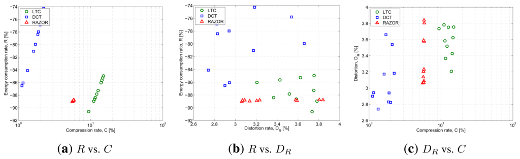 Figure 6 plots the outcome of this evaluation and shows RAZOR, in red with triangular markers, LTC, in green with round markers, and DCT, in blue with square markers. The three figures explore three different trade-offs: Figure 6a plots the compression rate percentage, C, on the x-axis and the energy consumption percentage with respect to the baseline consumption (no compression), R, on the y-axis; Figure 6b plots the distortion, DR, on the x-axis and R on the y-axis; while Figure 6c plots C against DR.