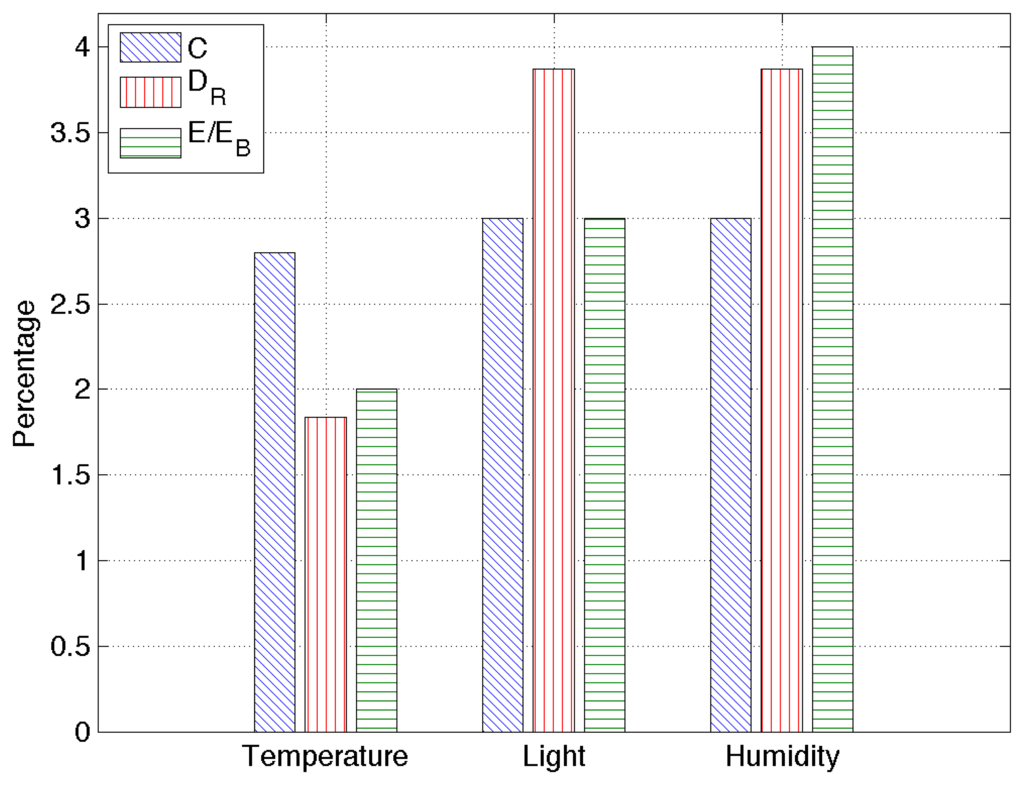 Figure 8 provides an overview of the obtained results: the compression rate percentage, C, the root mean square error, DR, and the percentage of energy used with respect to the energy needed to send uncompressed data, E/EB. Since all the percentages obtained here are very low, RAZOR's good performance is confirmed for real scenarios as well. In particular, our algorithm is capable of transmitting data over the network, consuming less than 10% of the energy needed to transmit the same data uncompressed, maintaining the root mean square error as low as a few percent.