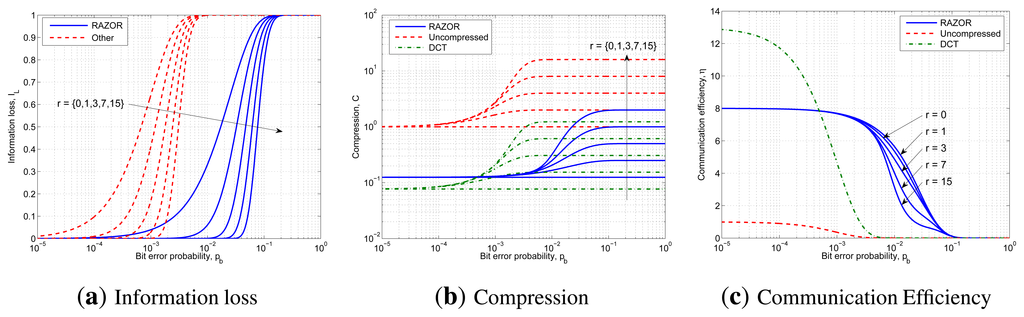 Finally, Figure 9c, which illustrates the efficiency of the three solutions, shows that DCT is the best compressor when the information loss is negligible, while RAZOR is clearly the preferable solution when pb > 10−3. Moreover, in terms of communication efficiency, r has no effect for both DCT and uncompressed transmission, while we noted that, for RAZOR, only a single retransmission improves the communication efficiency; thus, choosing the correct value for r is a trade off between robustness (high r) and energy consumption (low r).