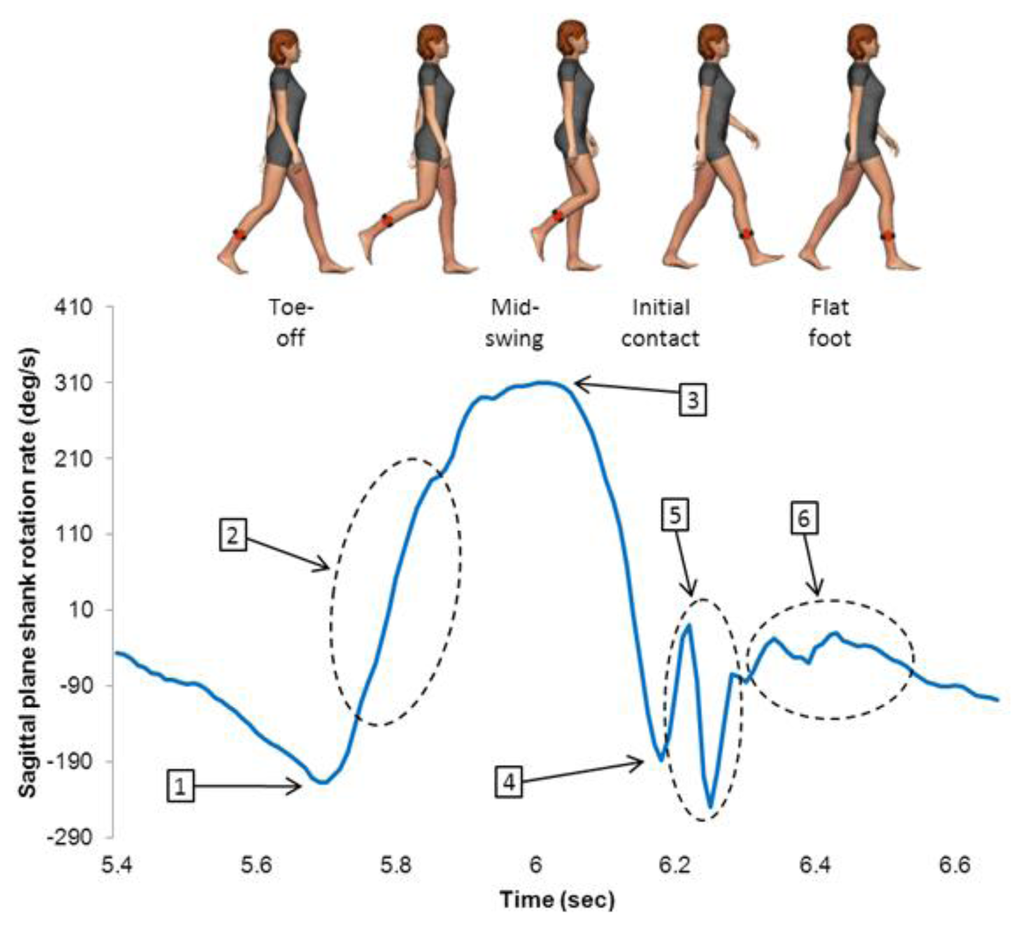 Two inertial sensors (Xsens MTx G25, Enchede, The Netherlands), sampling at 100 Hz, were placed on each subject. Each inertial sensor contained a 3-axis accelerometer and gyroscope. For the research presented in this paper, only the sagittal plane shank gyroscope signal was used. The signal range of the gyroscopes were ±1,200 degrees per second. They were placed on the anterior aspect of the tibia, attached to the CODA leg marker, with the centre of the inertial measurement unit at the mid-point between the lateral malleolus and the knee joint centre. The sensors were held in place with double sided tape as well as athletic tape.