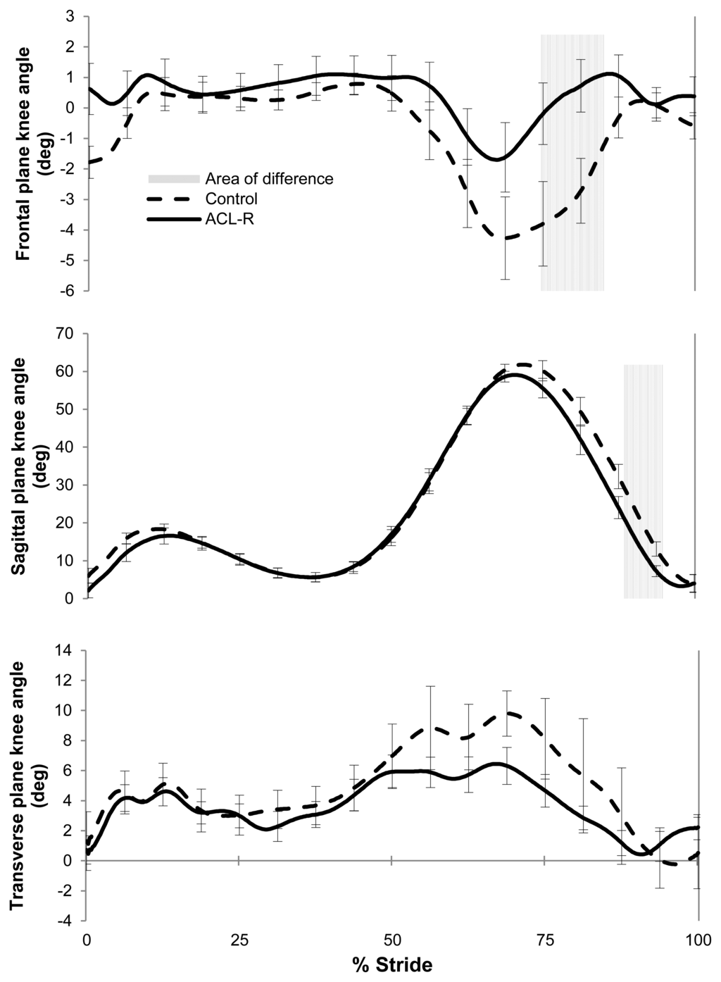 A comparison of time averaged profiles for knee angular displacement in coronal, frontal and sagittal planes showed that there were significant differences in knee joint kinematics between the groups during the swing phase (Figure 2). No differences were observed between groups during the stance phase of the gait cycle (Figure 2). The ACL-R participants displayed a more extended and more adducted knee position during swing phase than the control subjects.