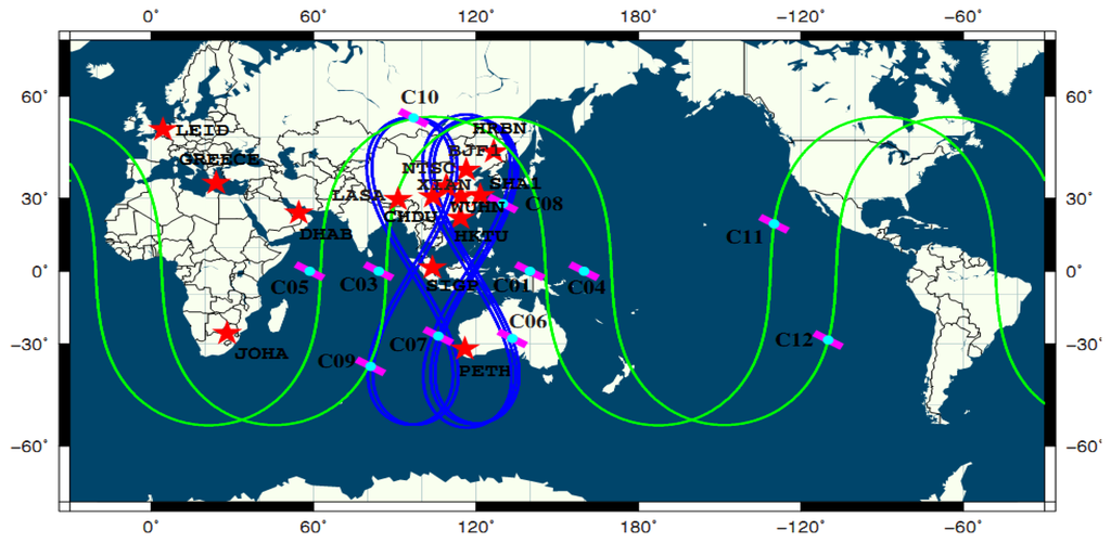 In order to obtain the precise orbits and satellite clock biases of BeiDou satellites to assess the performance of precise positioning, since 2011 Wuhan University has established a continuous worldwide observation reference network, called the BeiDou Experimental Tracking Stations (BETS), which includes nine tracking stations in China and six tracking stations abroad. All the stations are equipped with UB240-CORS receivers produced by the Beijing Unicore Communication Company, which can acquire the pseudo-range and phase observations of dual frequencies and dual systems. The Unicore UA240 dual-frequency dual-system high gain antenna is used in the network. The accuracy of phase observations can reach millimeter level [6]. The GEO C02 and MEO C30 did not work and were discarded [18]. The MEO C13 and C14 are not included as they were still under in-orbit testing. The GEO C15 was also under in-orbit testing and is planned to replace C02. Hence, 11 BeiDou satellites were employed for data processing in this contribution. They were four GEOs including C01, C03, C04 and C05, five IGSOs including C06–C10 and two MEOs including C11 and C12. Figure 1 shows the distribution of BETS around the world and the tracks of satellite points of the BeiDou system. As Figure 1 shows, the ground tracks of the five BeiDou IGSOs are confined from approximately 55°S to 55°N latitude and 102°E to 135°E longitude. They describe two “8” shape loops with a mean longitude difference of roughly 30°, so the eastern and western parts of China and the adjoining regions can be covered effectively. There are four GEOs distributed in the Indian and Pacific oceans over the Equator as supplements for the IGSO satellites to ensure users in Asian-Pacific regions can observe enough satellites. They are located at the 58.75°E, 80.0°E, 140.0°E, and 160°E longitudes, respectively. The inclination of the orbit of a BeiDou MEO is about 55°, and the orbit height is between that of GPS and Galileo satellites [19]. The revolution period is about 773 minutes, leading to 1.86 revolutions per day. The ground track of the satellite repeats every seven days [4].