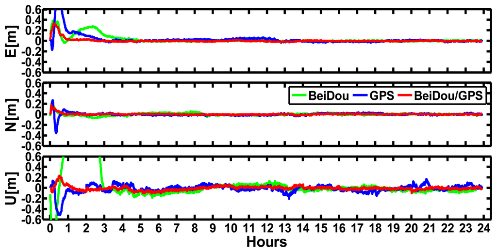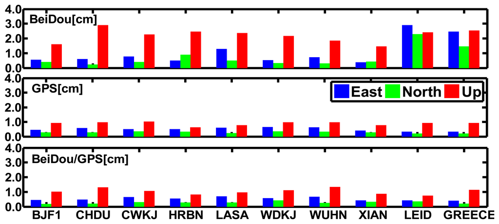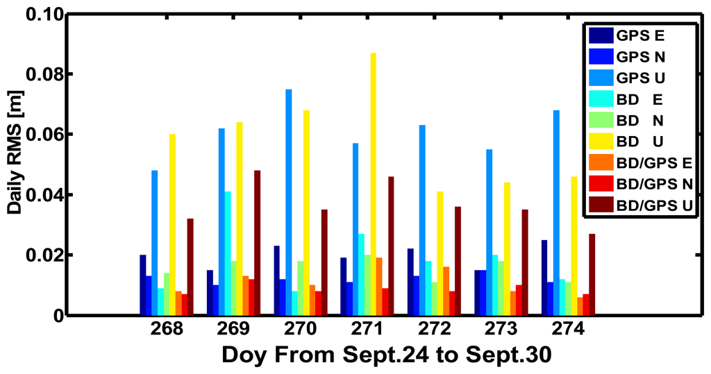 Figure 10 displays the daily RMS values of the results of the BeiDou, GPS, and BeiDou/GPS kinematic PPP in CHDU against the “ground truth” in the East, North, and Up components from September 24 to September 30 in 2012. We can find the following results: