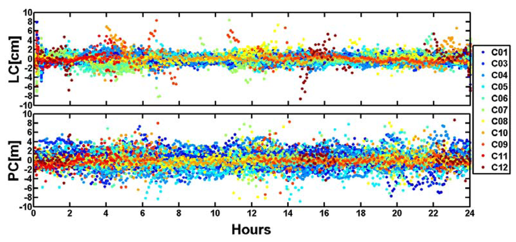 Observations residuals mainly contain the observation noises, multipath errors, orbit errors and mismodelled errors so that the residuals can be used as an important index to assess positioning accuracy [23–27]. Figure 11 shows the residuals of BeiDou satellite ionosphere-free undifferenced phase (LC) and code (PC) observations residuals of 10 stations of “BETS” on September 24, 2012 (DOY is 268). It can be seen that the LC residuals are nearly within ±2.0 cm and the PC residuals are within ±4.0 m, but because the weighting of code observations is very small compared with that of phase observations, it does not influence the final results significantly.