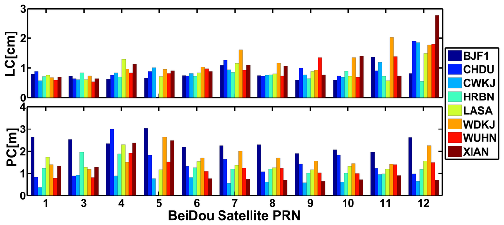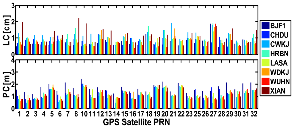 Figure 12 shows the RMS values of the residuals of BeiDou satellites for each site of “BETS” on September 24, 2012. The average RMS values of undifferenced LC and PC residuals are listed in Table 3. Figure 13 shows the RMS values of the residuals of GPS satellites for “BETS” on September 24, 2012. On the basis of these figures and table, we can find that: