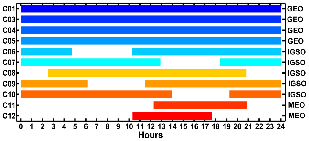 Figure 2 shows the visibility of BeiDou satellites at CHDU on September 24, 2012. It can be seen from the figure that four GEO satellites C01, C03, C04 and C05 are tracked all day long, while five IGSO satellites C06–C10 are not tracked continually without breaks for 24 h. The lengths of the data gaps for all the IGSO satellites are about 4.5 h. Two MEO satellites (C11 and C12) are tracked in a shorter time than that of GEO and IGSO satellites. It is also seen that at least three IGSO satellites are tracked at every moment so at least seven BeiDou satellites are tracked for every epoch, which guarantees the realization of BeiDou PPP.