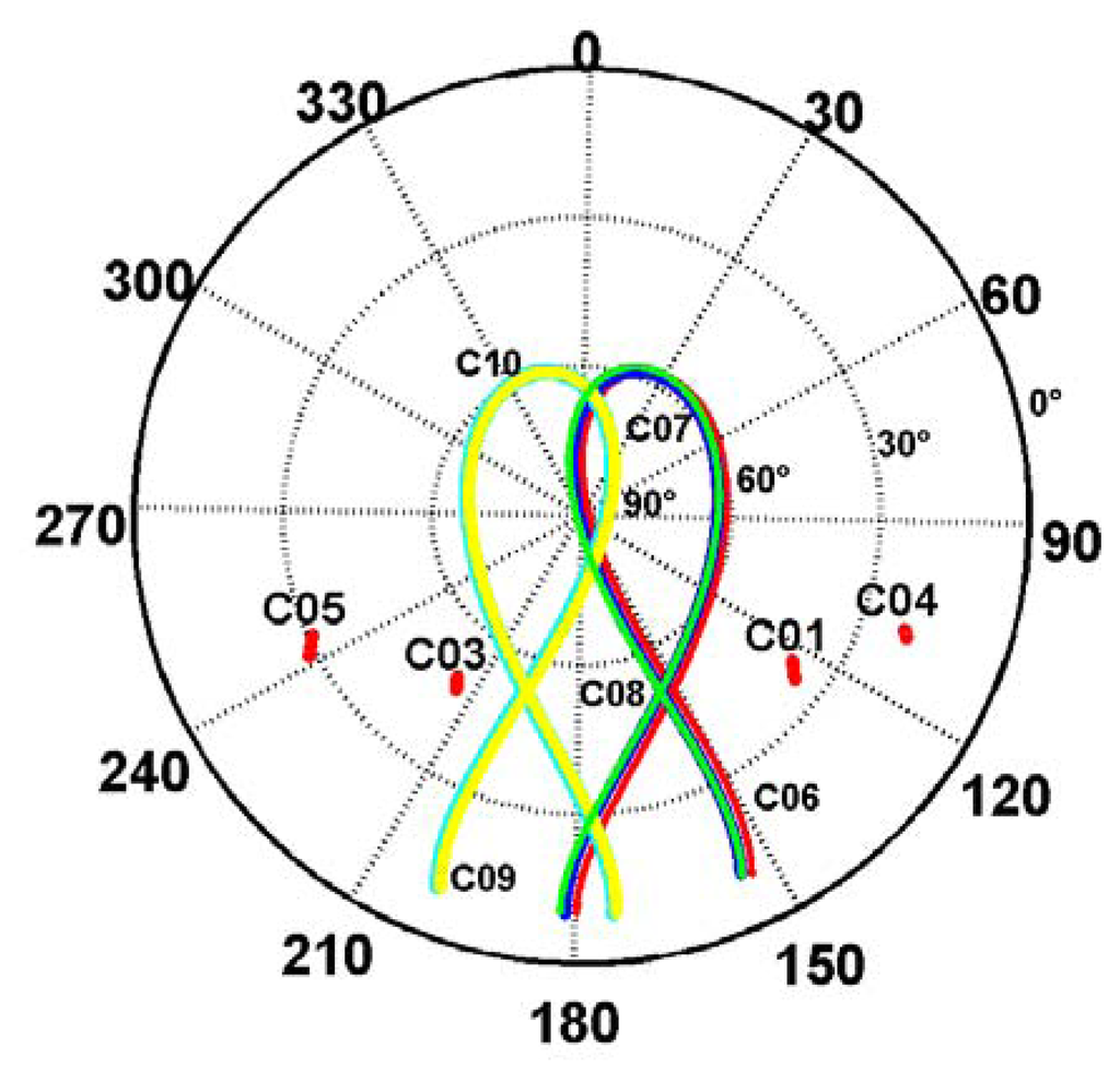 Figure 3 shows the sky plots of five IGSO and four GEO satellites against the azimuths and elevations. It can be seen that the elevations and azimuths of C01 are within 30–45° and within 120°–135° and that of C03 are within 45°–60° and within 210°–225°, respectively. The elevations of C04 and C05 are lower than that of C01 and C03, as they are further away from the station. Meanwhile, the five IGSO satellites have a ground track of an incomplete “8” shape as their elevations are below the mask angle and the satellites cannot be observed. Furthermore, we can find that for mainland China, the BeiDou GEO and IGSO satellites cover the southern hemisphere most of the time.
