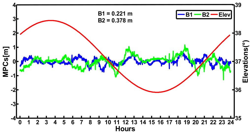 We processed the data of the CHDU station on September 24, 2012 to analyze the multipath and noise error. The station is equipped with the Unicore UB240-CORS receiver and UA240 antenna. The mask elevation is 7° and the interval is 30 s. Figure 4 displays the MPCs of the B1 and B2 codes and the variation of the elevations of satellite C01 at CHDU on September 24, 2012. It can be seen that the variations of the elevations of C01 are within 35°–39°. The MPCs of B1 and B2 codes of satellite C01 have small changes with the variations of the elevations. The MPCs of B1 codes are steadier than that of B2 codes and the standard deviation of the MPCs of B1 codes is smaller than that of B2 codes. Furthermore, both the MPCs of the B1 codes and B2 codes are within ±1 m.