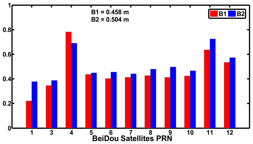 Figure 5 shows the standard deviations of the MPCs of the B1 and B2 codes of the BeiDou satellites. The standard deviations of MPCs of B1 and B2 codes of the BeiDou satellites are smaller than 0.5 m, except for C04, C11 and C12 and the average values are 0.458 and 0.504 m, respectively. The standard deviations of MPCs of B1 codes are smaller than that of B2 codes, except for C04. We also can see that the MPCs are different for different types of satellites. The GEO satellites, except for C04, have the best performance while the MEO satellites have the worst performance.