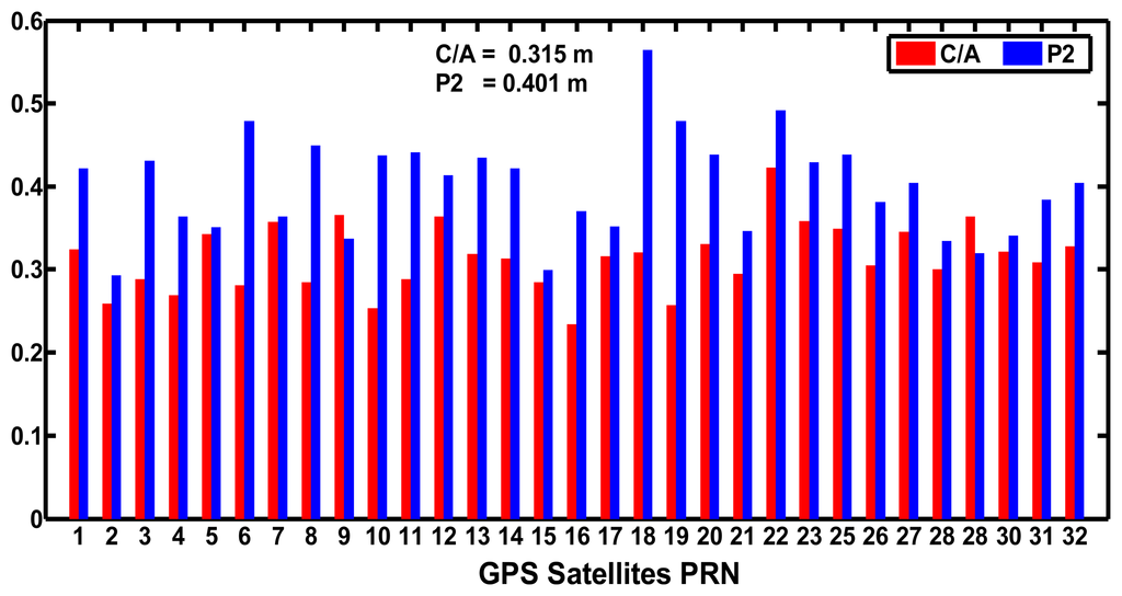 Figure 6 shows the standard deviations of the MPCs of C/A and P2 codes of GPS satellites. The standard deviations of C/A and P2 codes of all the GPS satellites are less than 0.50 m except for the G18 satellite. The average values of the standard deviations of the C/A codes of all the GPS satellites are 0.315 m, which is smaller than that of the B1 codes of BeiDou satellites. The average standard deviations of P2 codes are 0.401 m, smaller than that of the BeiDou B2 codes. The results above show that the accuracy of GPS code observations at the CHDU station is better than that of the BeiDou code ones. The values do not mean that BeiDou code observations are worse than GPS ones. The reason may be that the MPCs derived based on Equations (1) and (2) were composite values that not only include the pseudo-range multipath error but also other errors, such as the pseudo-range and phase noise, and the hardware delay in the receivers and satellites. In addition the BeiDou system constellation is not complete, but the GPS statistics contain all satellites of the constellation.