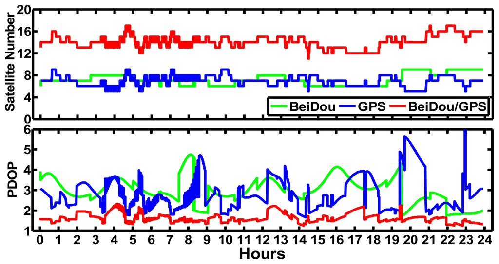 As Figure 9 has shown, at least five satellites can be seen at CHDU in every epoch for BeiDou kinematic PPP and the variation PDOP is from 2 to 6. The satellite numbers of combined BeiDou and GPS positioning increase significantly and at least 12 satellites are used in every epoch. The PDOP decreases obviously than that of BeiDou-only and GPS-only cases. As a result, BeiDou/GPS kinematic PPP shows better precision and shorter convergence time than that of BeiDou-only and GPS-only kinematic PPP.