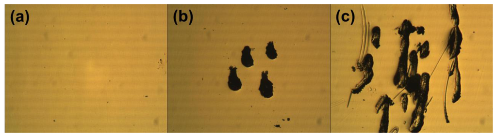 We investigated the optical microscope images of the gold electrodes on a COC plate after probing by conventional methods. The optical microscope images in Figure 1 show how the gold electrodes were damaged or deformed by probing. The flat gold electrode before probing (Figure 1a) was deformed by scratches while probing with conventional probing methods such as a needle-like probe and alligator clip (Figure 1b,c). The mechanically controlled contact of needle-like probes left short scratches, from sliding on the surface of the gold electrode. Manual clipping of the alligator clip left more intense scratches on the gold electrode as the manipulation was subject to shaking and movement. Because scratches are the typical results of mechanical abrasion on metal layers by shear forces, it is deduced that a probing method with a minimal shear force will reduce the mechanical deformation of the gold electrode.