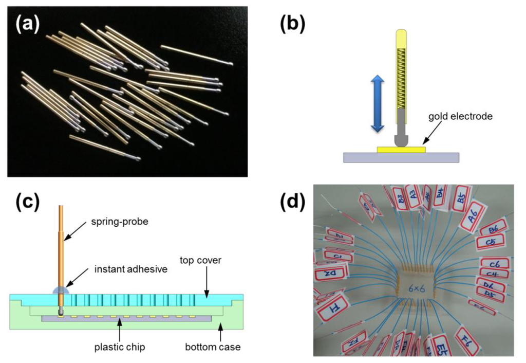 The spring-probe system in Figure 2d had a drawback in that the position of the spring-probe was fixed at the arranged place. Thus, it was only fit for the specific LOC design which had no more than 24 electrodes in the relevant positions matching the positions of the spring-probes. In research groups or laboratories, various LOC designs are evaluated, so if one must fabricate a spring-probe system per each single design, it would be wasteful of time and effort.