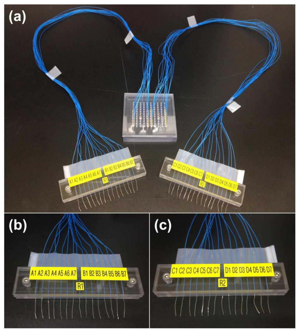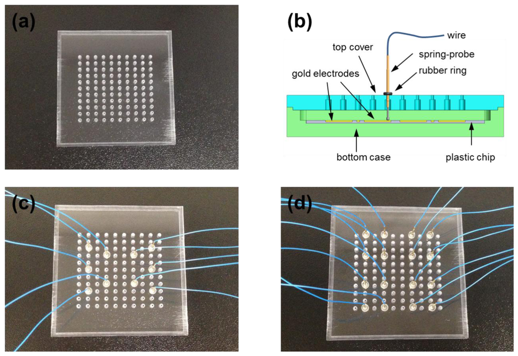 Examples of this reconfigurable assembly are shown in Figure 4c,d. Spring-probes in a configuration for 10 electrodes (Figure 4c) were easily relocated to the positions for needed for 16 electrodes (Figure 4c) within minutes. For this reason, the universal spring-probe system was expected to meet various LOC designs.