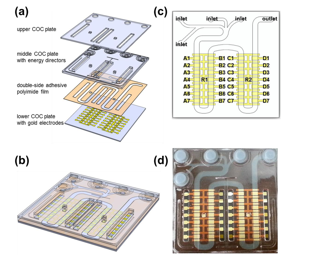 The LOC was composed of three COC plates (60 × 60 mm, 1 mm thick) that were formed by an injection mold machine (A270C400-100, Arburg GmbH, Lobburg, Germany). The lower one was a flat COC plate. The middle one had open areas for probing, energy directors for ultrasonic welding and inlet and outlet structures. The upper one also had open areas for inlet, outlet and probing. For electrode patterning, gold (200 nm) with chromium (20 nm) as adhesion layer were deposited on the lower COC plate with shadow mask using an evaporator (EBS400, Evatec, Flums, Switzerland).