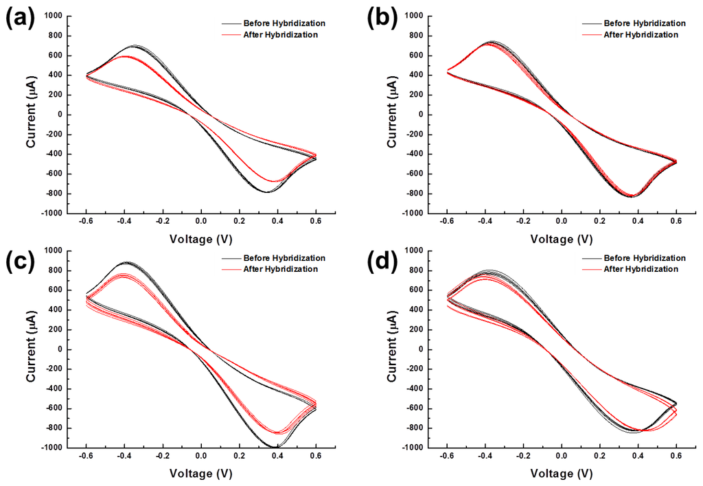 A total of forty voltammograms were plotted in Figure 7 according to the experimental conditions. Oxidation and reduction peaks were significantly reduced after hybridization in the cases of PM (Figure 7a,c). On the other hand, voltammograms of MM were not changed much after hybridization (Figure 7b,d). This result proved that DNA hybridization was successfully detected by both probing methods. However, the voltammograms recorded using the universal spring-probe system were observed to be different from the voltammograms obtained using alligator clips. Each set of five voltammograms for the spring-probe overlapped closer than those of alligator clipping. This observation intuitively indicated that the universal spring-probe system provided more reliable probing than alligator clipping.