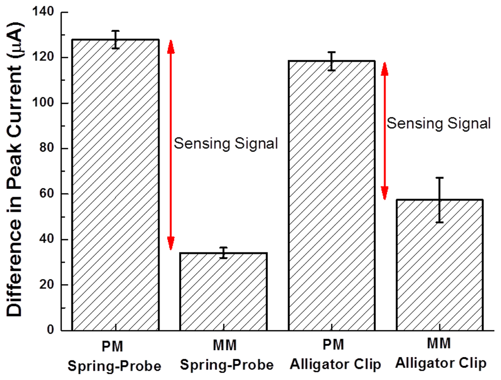The standard error of the difference in peak currents for PM and MM using the spring-probe were 3.8 μA and 2.3 μA, respectively. Meanwhile, the standard error for PM and MM using the alligator clip were 3.9 μA and 9.7 μA, respectively. This result was in accord with the result of amperometric I-T curves in Figure 3c. Furthermore, the gap of the difference in peak currents between PM and MM for the spring-probe sensing of the signal of hybridization, was wider than the gap for the alligator clip. It was deduced that reliable probing eventually enhanced the electrochemical detection sensing signal.