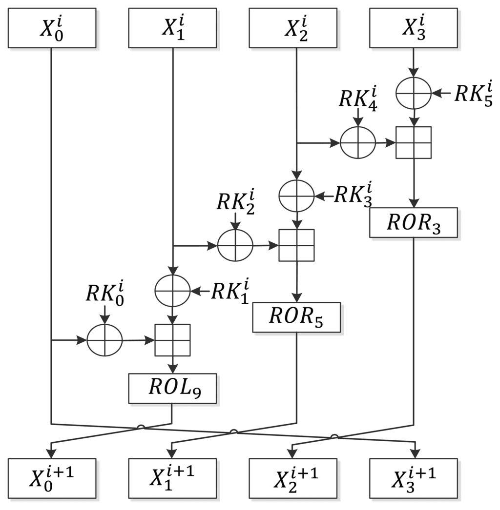 As described in Section 2.1, LEA-128/192/256 iterates in 24/28/32 rounds. Unlike AES [10] or HIGHT [2], which require a special final round function, LEA uses only one round function. Figure 1 shows the round function of LEA. At the beginning of the encryption, the intermediate state X is set as where 0 ≤ n < 4 and the following round function is executed r times: