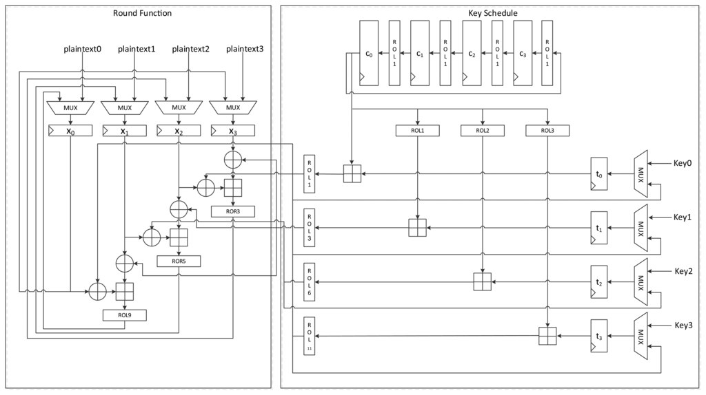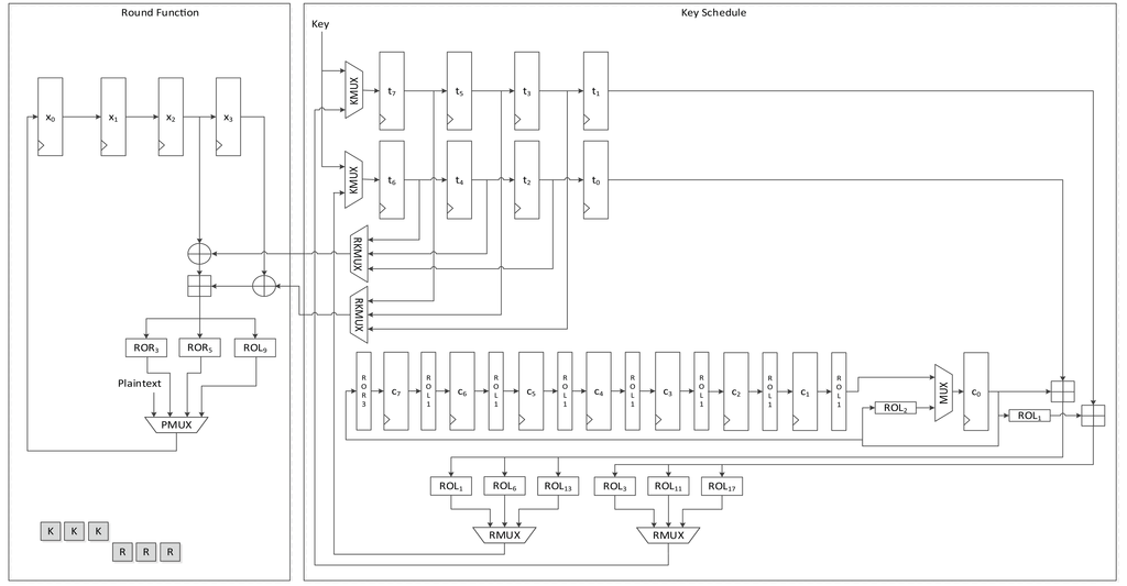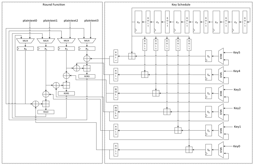 Figure 5 shows the data path of LEA-128-AREA-1. The left side of the data path deals with the round function and the right deals with the scheduling. Twelve 32-bit registers are used. x0 to x3 are registers that save the internal state, while t0 to t3 are key registers. The remaining four registers, c0 to c3, are constant registers.