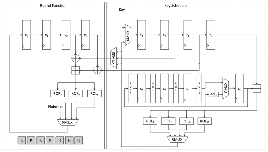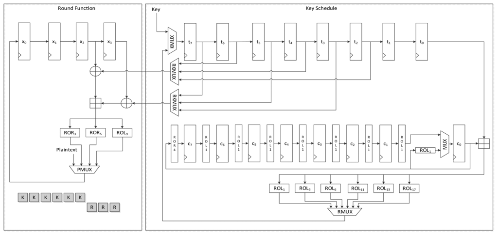 Plaintexts X0 to X3 are supplied to registers x0 to x3 in reverse order through the leftmost path of PMUX, and keys T0 to T3 are shifted using the upper path of KMUX and stored in registers t0 to t3. Four clocks are required to schedule keys, and three clocks are required to update states in a round. Keys in each 32-bit register are scheduled one by one. In accordance with Equation (2), the key in register t0 is added to a constant and rotated left to a specified number, and is then stored in register t3. After four clocks of the key scheduling cycle, the round function begins to run. According to Equation (5), two XOR and one addition operations are repeated in a round. For the area-optimized version, we tried to reduce the area by sharing the operations. (X2, X3), (X1, X2), and (X0, X1) are sequentially fed to the two XORs, and both results are added. Scheduled round keys are supplied from registers t0 to t3. Since T1 is always required for the input of one XOR, the output of t1 is directly connected to the input of the other XOR. The remaining outputs of t0, t2, and t3 are selected by RKMUX, and then keys are supplied in (RK0, RK1), (RK2,RK1) and (RK3,RK1) order. The output of the adder is then fed to three rotation logics, and one of them is chosen along with clock cycles and stored in register x0. In this case, 7 clock cycles are required for a round, thereby completing encryption in 168 clock cycles excluding cycles for input and output.