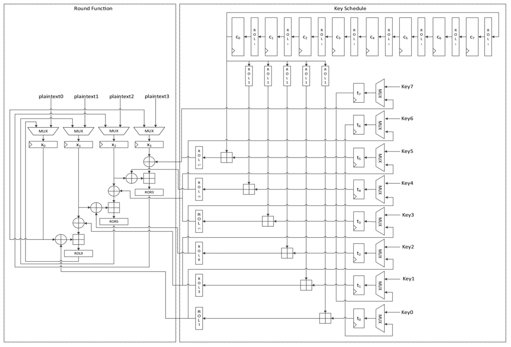 The structure of LEA-256-SPEED is depicted in Figure 13. LEA-256 schedules six of eight round keys for a round, and the remaining two and following four keys are used for the next round key generation. Therefore, values in t0 to t5 are scheduled and stored in the ti+2 register. The values not used values in t6 and t7 are moved to t0 and t1, respectively. This implementation requires 32 clock cycles to encrypt a 128-bit plaintext.