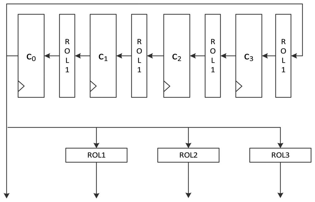 Figure 2 shows the intuitive structure of the constant schedule logic of the 128-bit speed-optimized version of LEA hardware. The speed-optimized version executes one round per clock cycle. Therefore, it should generate all four constants required for a round. Constants δ0 to δ3 are stored in 32-bit flip-flops c0 to c3. Each value in a 32-bit flip-flop moves to the next flip-flop per round. Since a constant value that is rotated i-times (i + 1, i + 2, and i + 3 times) is used for the i-th round, it is rotated 1 bit left for every round. Since the constant used for the i-th round is located at the c0 register, its value is exactly ROLi(δi mod 4). The remaining ROLi+1(δi mod 4), ROLi+2(δi mod 4), and ROLi+3(δi mod4) are generated from corresponding ROL1, ROL2, and ROL3 operations. In the figure, no rotation consumes any logical gates because they can be easily implemented by crossing some wires. Thus, the logic requires only 128 flip-flops.