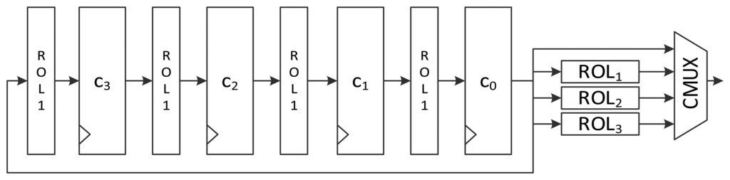 To minimize the number of gates required, some logic gates are shared and iteratively used in a round. In area-optimized implementation, one round can be split into several clock cycles. Therefore, four constants must be generated one by one in a round. The intuitive structure of constant scheduling logic is depicted in Figure 3. At the beginning of a round, c0 is fed with ROLi(δi mod 4) from c1. The value is passed to the key scheduling logic through the first path of the MUX. For the remaining clock cycles of one round, ROLi+1(δi mod 4), ROLi+2(δi mod 4), and ROLi+3(δi mod 4) are fed to the key scheduling logic using the second, third, and fourth path of the MUX.