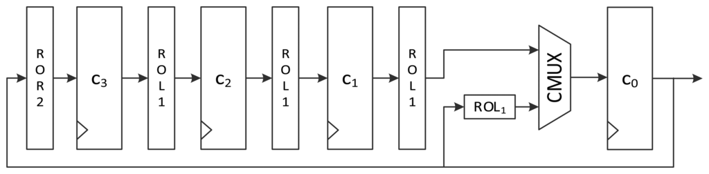 An alternative logic structure for area-optimized LEA is depicted in Figure 4. The 32-bit constant in c0 is fed to the key scheduling logic. When the round counter is increased, the upper path of MUX is used, which leads ROLi(δi mod 4) at c1 to move to the c0 register. In a round, the remaining constant values used for the i-th round function, ROLi+1(δi mod 4), ROLi+2(δi mod 4), and ROLi+3(δi mod 4), are generated during the remaining three clock cycles using the lower path of MUX. By using this structure, the cost for the four-input MUX is reduced to that of a two-input MUX. Moreover, the rotating logic before c3 is different from that in Figure 3. At the final state of a round, the c0 is ROLi + 3(deltai mod 4). To make ROLi + 4(deltai mod 4) have the same value at a register after four rounds, c0 should be rotated to the right twice. Consequently, the rotation logic before the c3 register in Figure 3 is different from that in Figure 4.