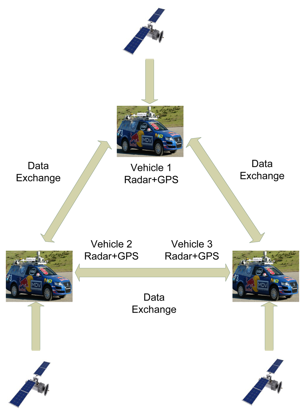 Accurate vehicle localization is the current trend in the field of intelligent vehicles for the purpose of autonomous driving. Single vehicle localization is often performed by fusing both proprioceptive and exteroceptive sensors presented in [1]. Furthermore, GPS [2,3], cameras [4], laser scanners [5,6], dead reckoning [7] and Boolean information [8] are also used. However, with the developed inter-vehicle communication technology [9], the information exchange among the vehicles becomes available. With a wireless communication device, the multiple vehicle cooperative localization can be improved by taking advantage of information sharing. Various methods are investigated for cooperative localization, such as Extended Kalman Filter [10–12], Bayesian formalism [13], Markov Localization [14], Maximum Likelihood Estimation [15] and Maximum A Posteriori Estimation [16,17]. In our previous work [18], we presented a probability hypothesis density (PHD) solution for the purpose of addressing the following issues: