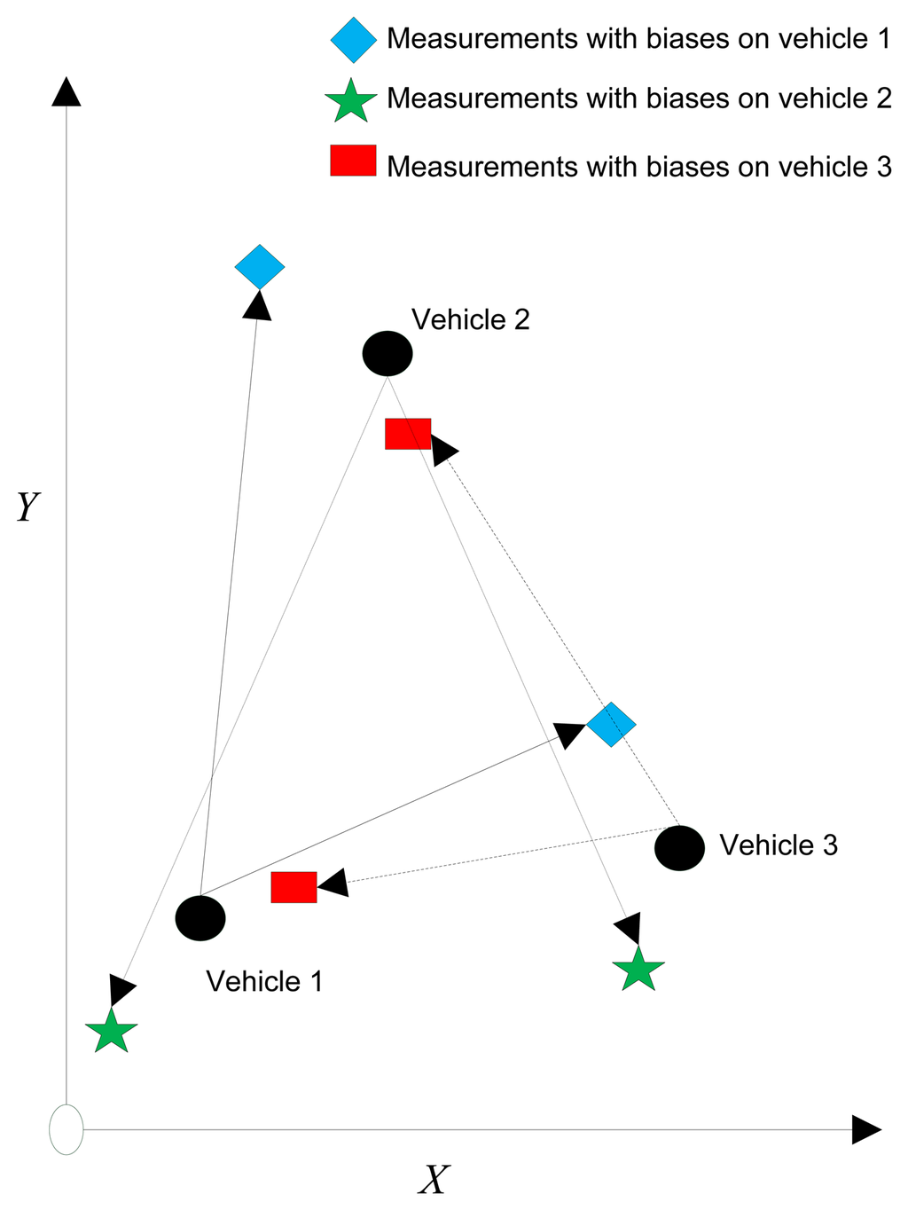 Each vehicle is able to measure the relative position of the other vehicles. Here, we assume that the measurements are formatted with the range and bearing in a local coordinate. Furthermore, each measurement error is formed of white noises and fixed biases.