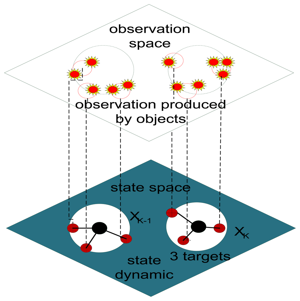 The targets in a multi-target scenario at time k are represented as a finite set of vectors, Xk,1,…, XkN(k), which takes values from the state space, χ ∈ ℝnx.